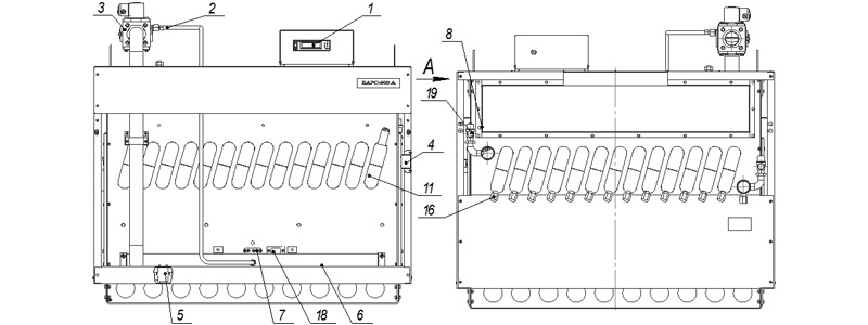 9. Глазок для розжига 10. Сливная пробка 11. Рым-болт 12. Регулятор температуры 13. Дверка 14. Патрубок присоединения к газопроводу 15. Предохранительный клапан . |